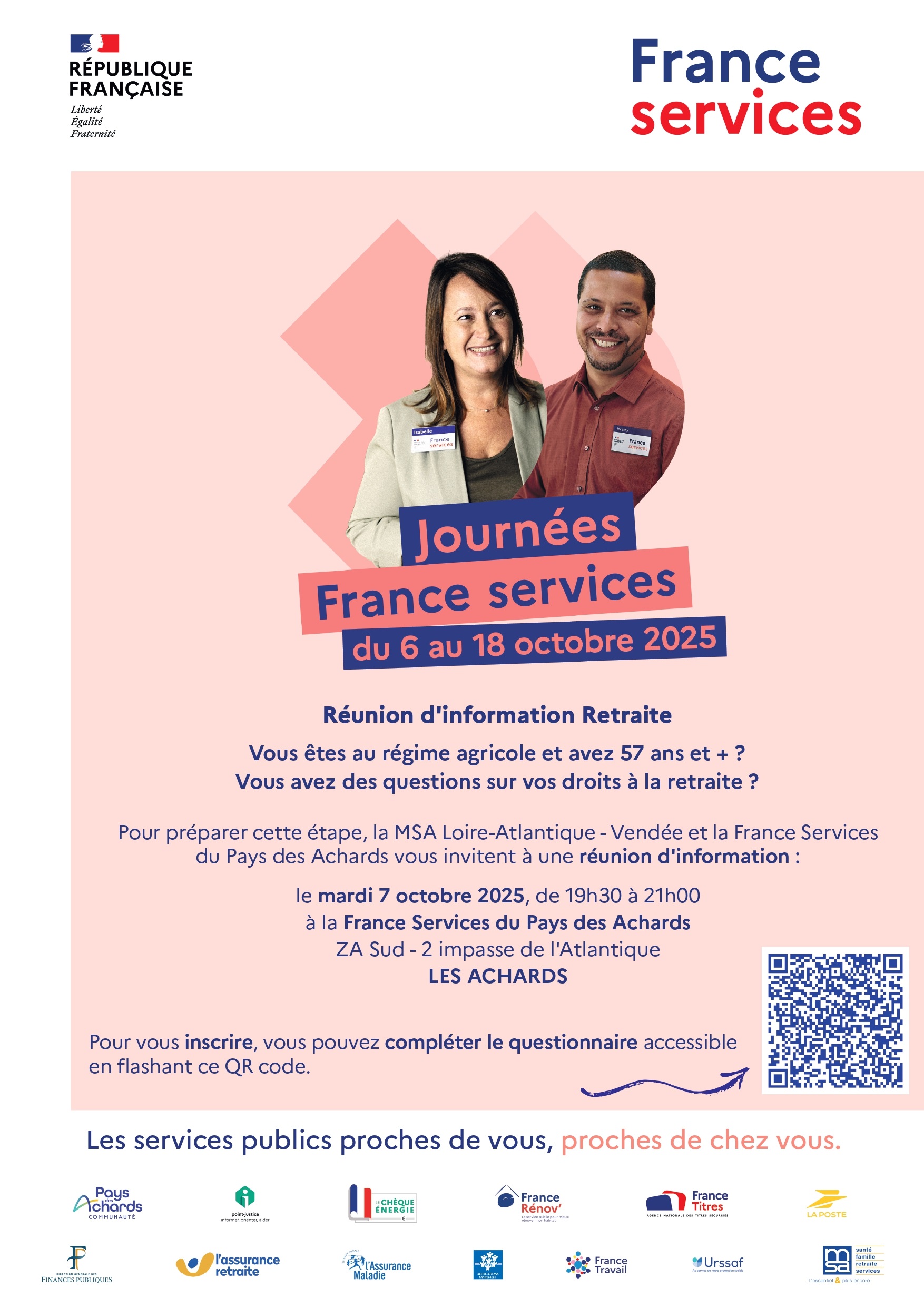 Dans le cadre des portes ouvertes nationales, la MSA Loire-Atlantique Vendée et France Services du Pays des Achards proposent une réunion d’information retraite.